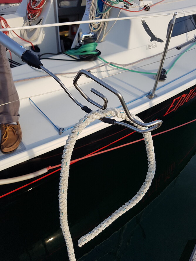 Mooring Mate is a boon to boats berthed at a swing or floating mooring. Even at marina berths the Mooring Mate will lift the mooring line off the jetty with ease and certainty at the flick of your wrist or easily retrieved from a hanging line.